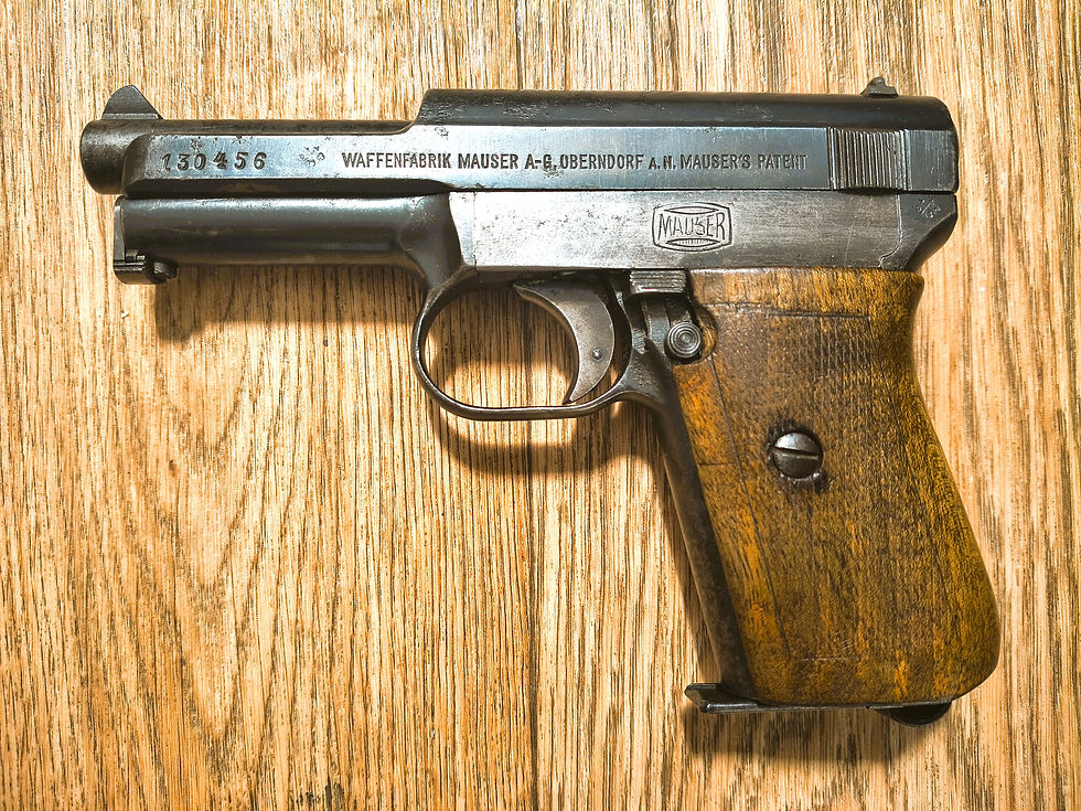 Deactivated Mauser pistol, chambered for 7.65 x 17 Browning (.32ACP) cartridge and known as the Model 1910/14. This model of the Mauser pistol was a revised version of the Model 1910 chambered for 7.65 to appeal to police forces, replacing the earlier 6.35 (.25ACP) 1910 version. This example can cock, dry-fire and field-strip. The cocked warning indicator (a nice feature on such an earlier semi-auto handgun) functions (see photos). Supplied with 2 inert .32ACP rounds (see photo). Comes with its deactivation certificate. Conditions apply (see T & Cs).